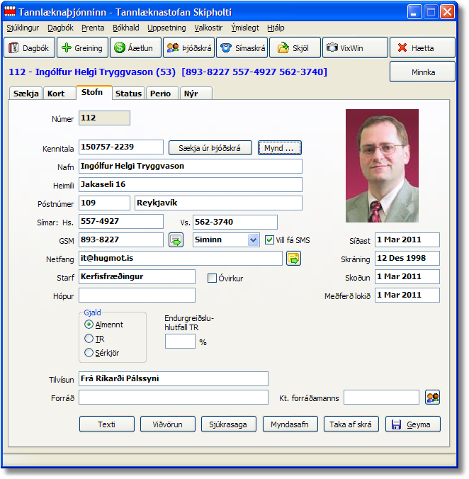 Forritið innifelur dagbók fyrir tímapantanir, skráningu á helstu atriðum um sjúklinginn og utanumhald um þær aðgerðir sem framkvæmdar hafa verið á honum.